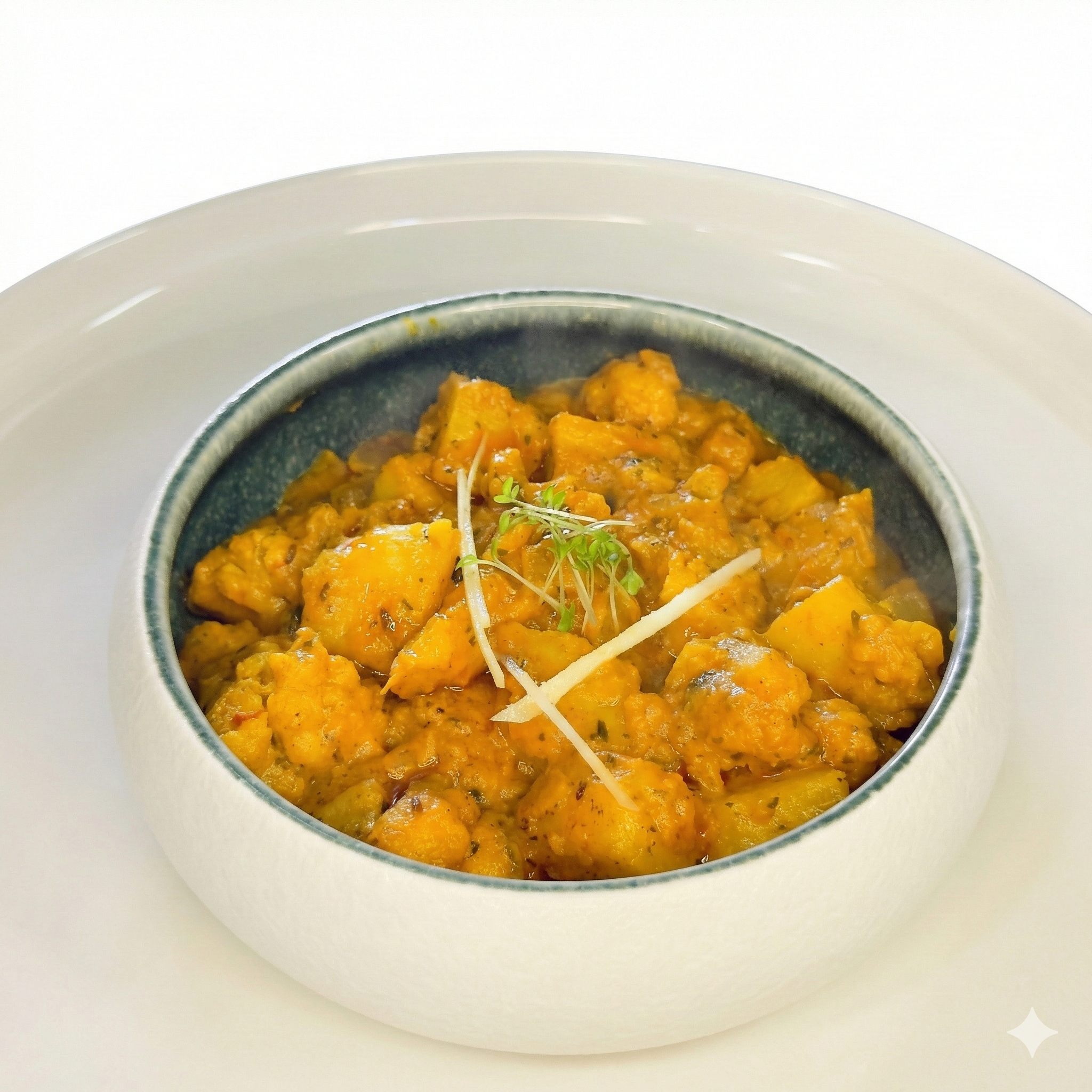 Kartoffeln, Blumenkohl, Tomaten, Ingwer, Zwiebel, serviert mit Basmati Reis