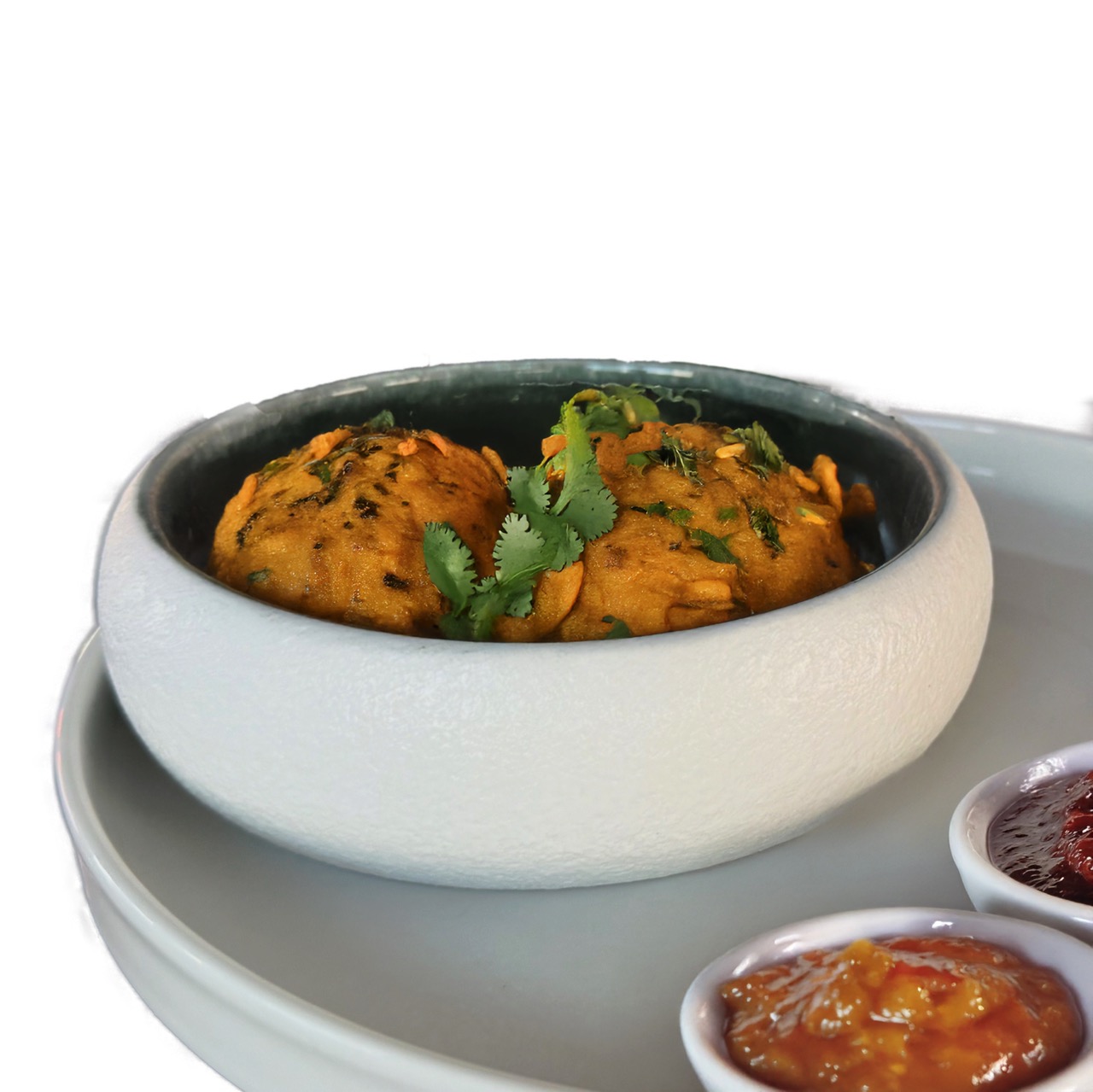 Indischer Paneerkäse, Kichererbsenmehl, Chutney, gebacken (G)