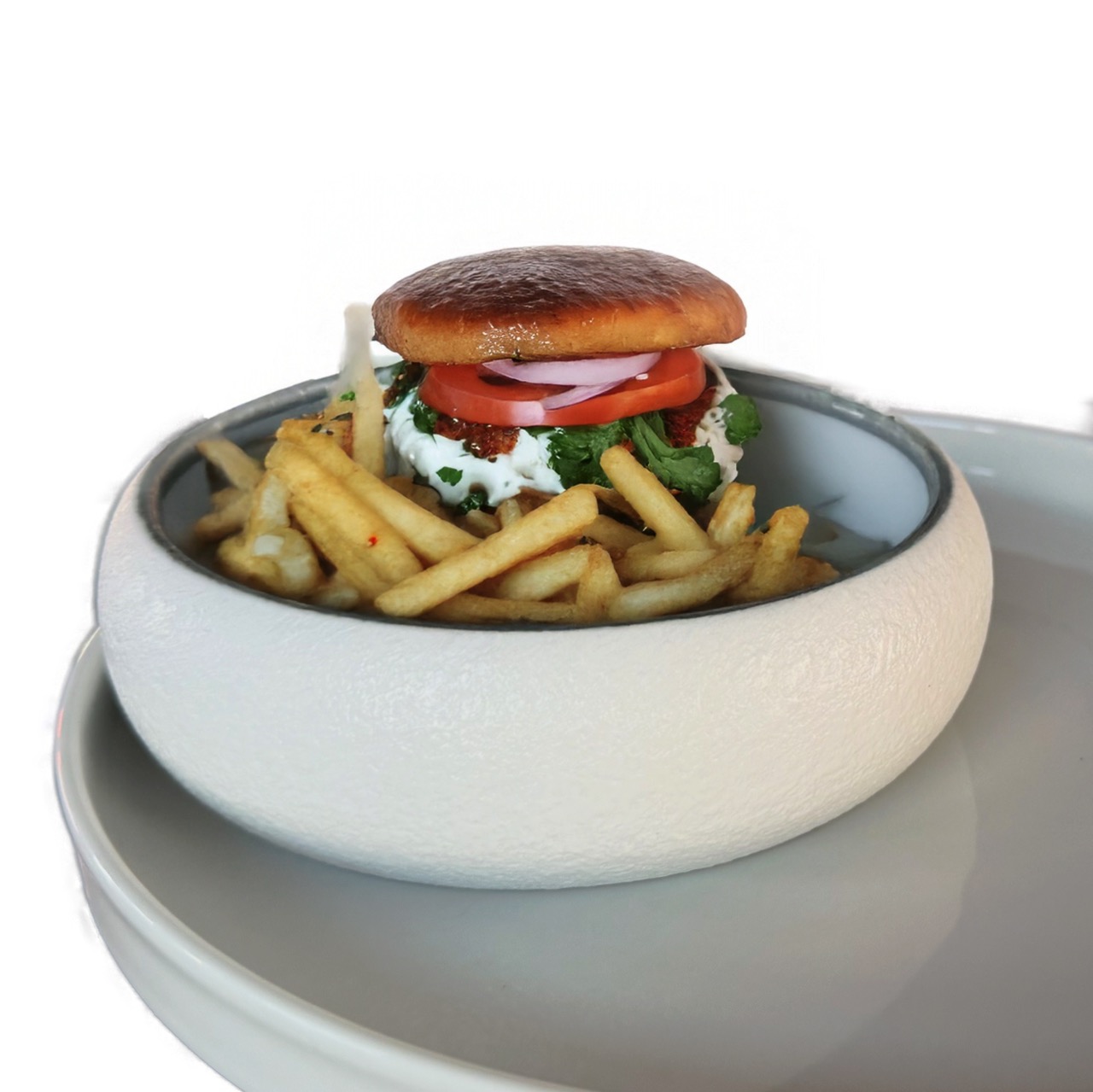 Indischer Frischkäse, Brioche-Brötchen, Tomaten, Zwiebel, Salat, Rucola, mit Masala Fries (A, G)